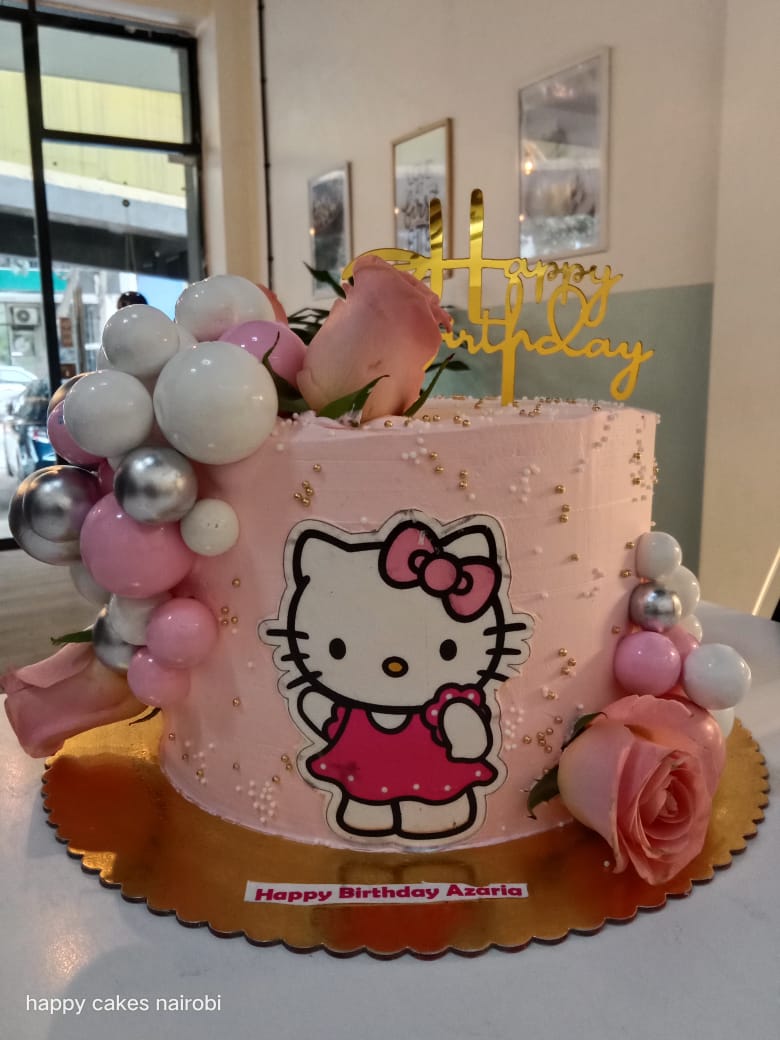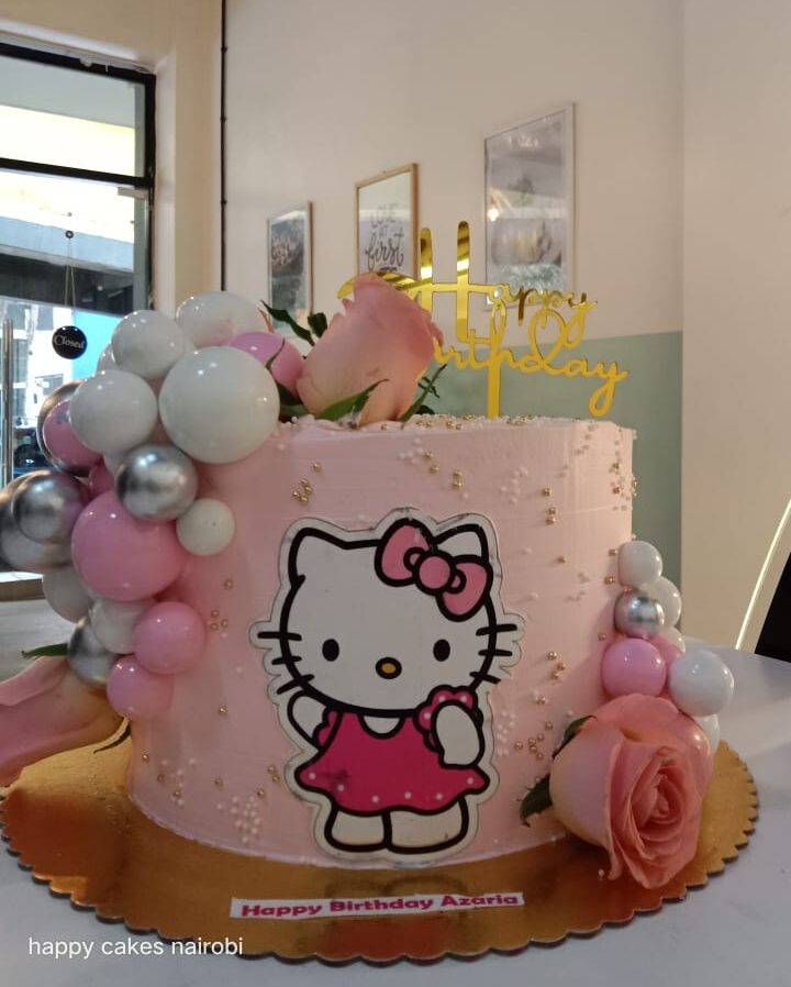 Make it a purr-fect celebration with this adorable Hello Kitty-themed cake! Featuring soft pink tones, pretty roses, pearl-like balloons, and a charming Hello Kitty design, it’s a sweet and stylish treat for any fan of the iconic character