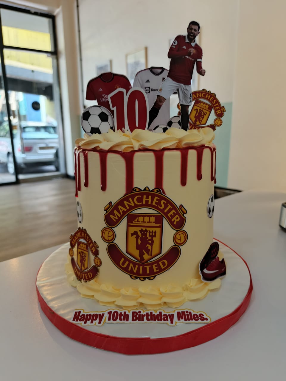 Celebrate your little champion with this vibrant Manchester United cake! Featuring football toppers, club logos, and a red drip finish — it’s a winning choice for any young fan’s birthday.